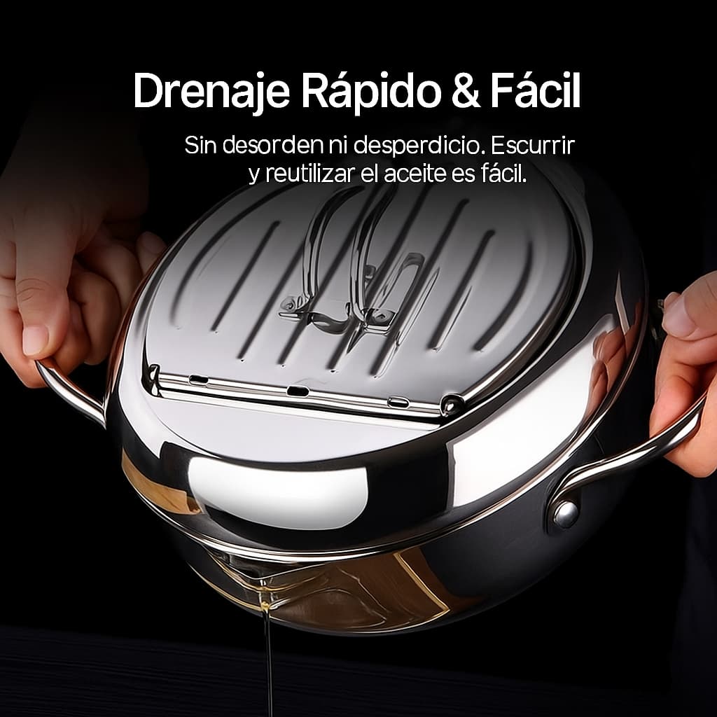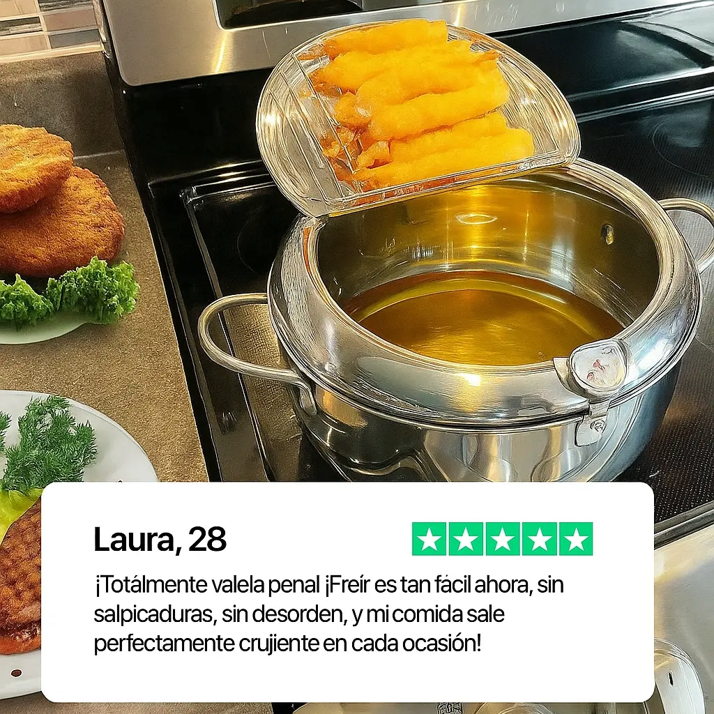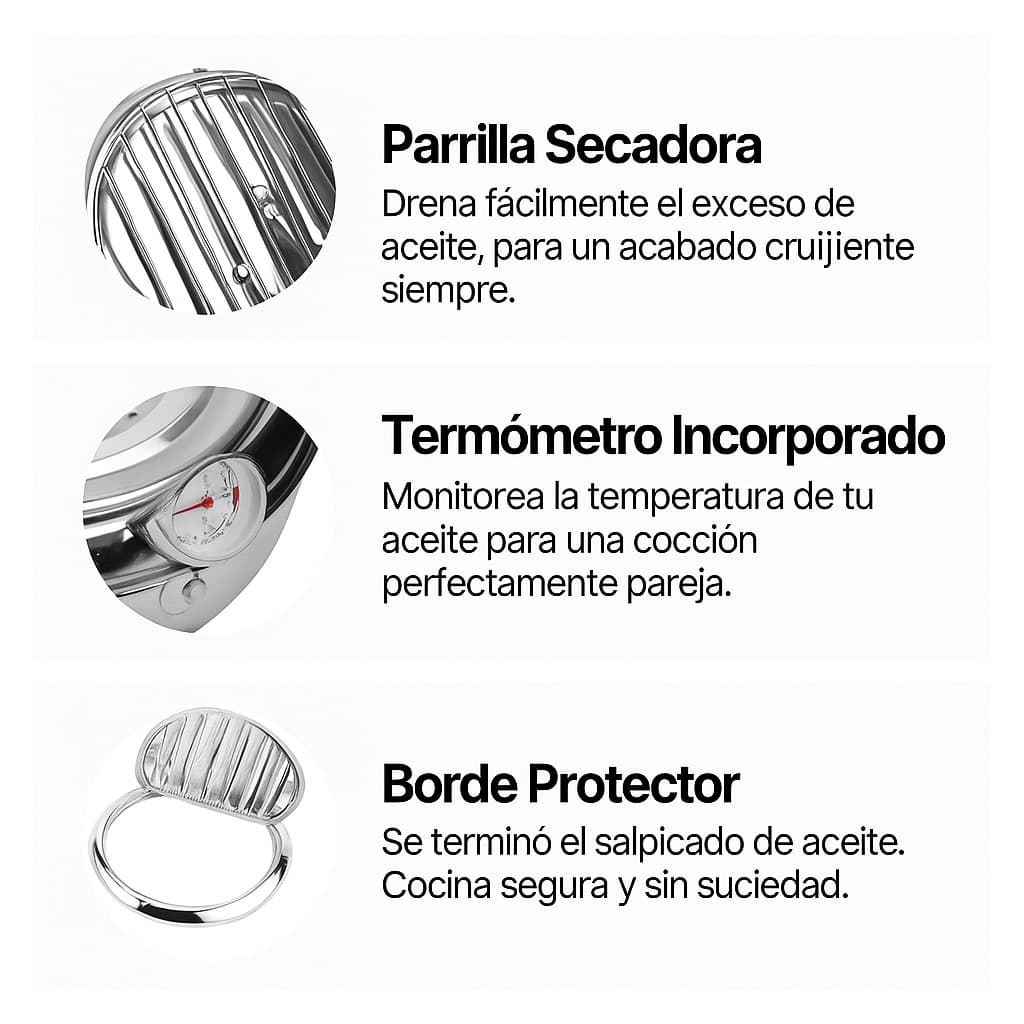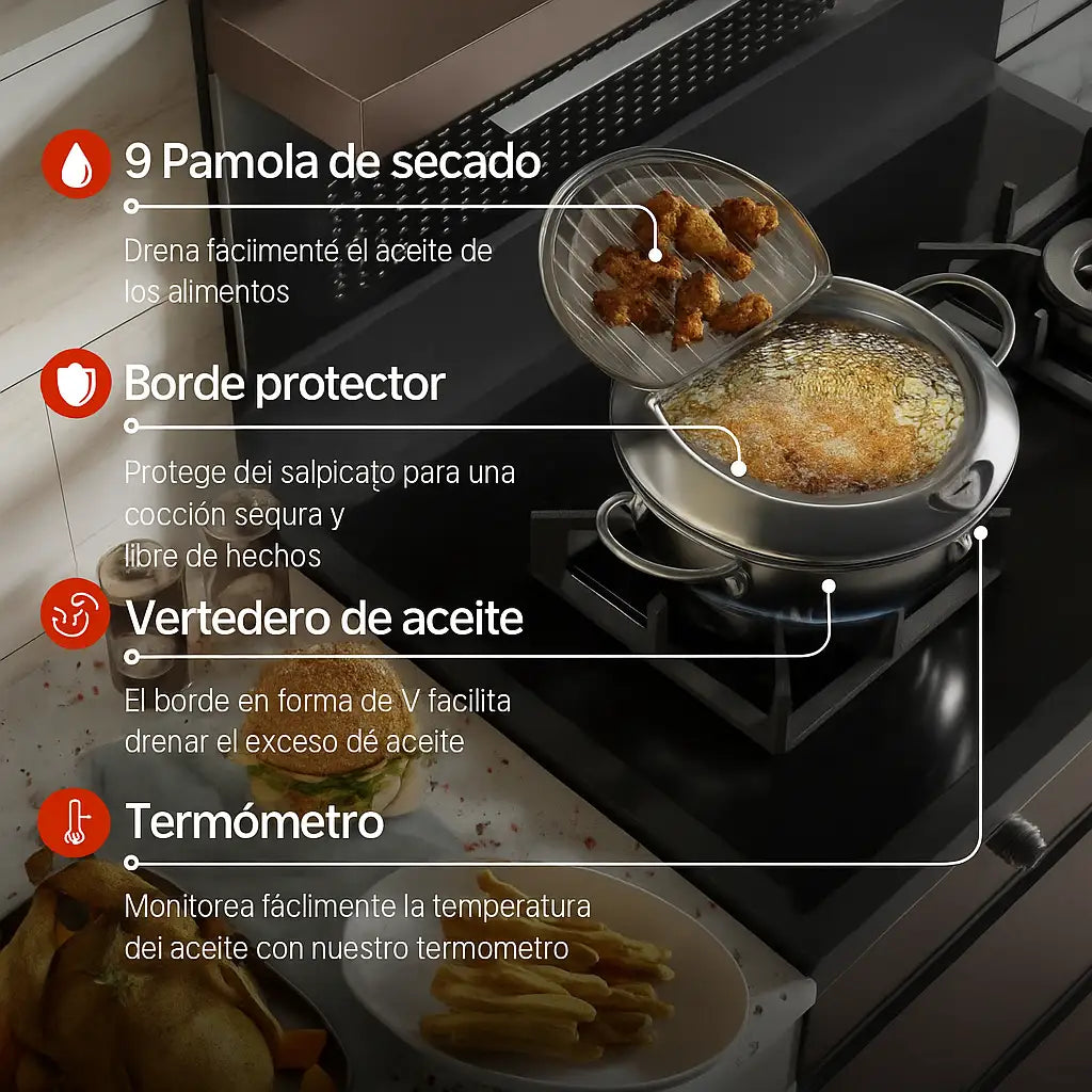 Con termómetro y rejilla incluidos. Obtén frituras doradas y crocantes de restaurante, sin desorden y sin pasos adicionales.